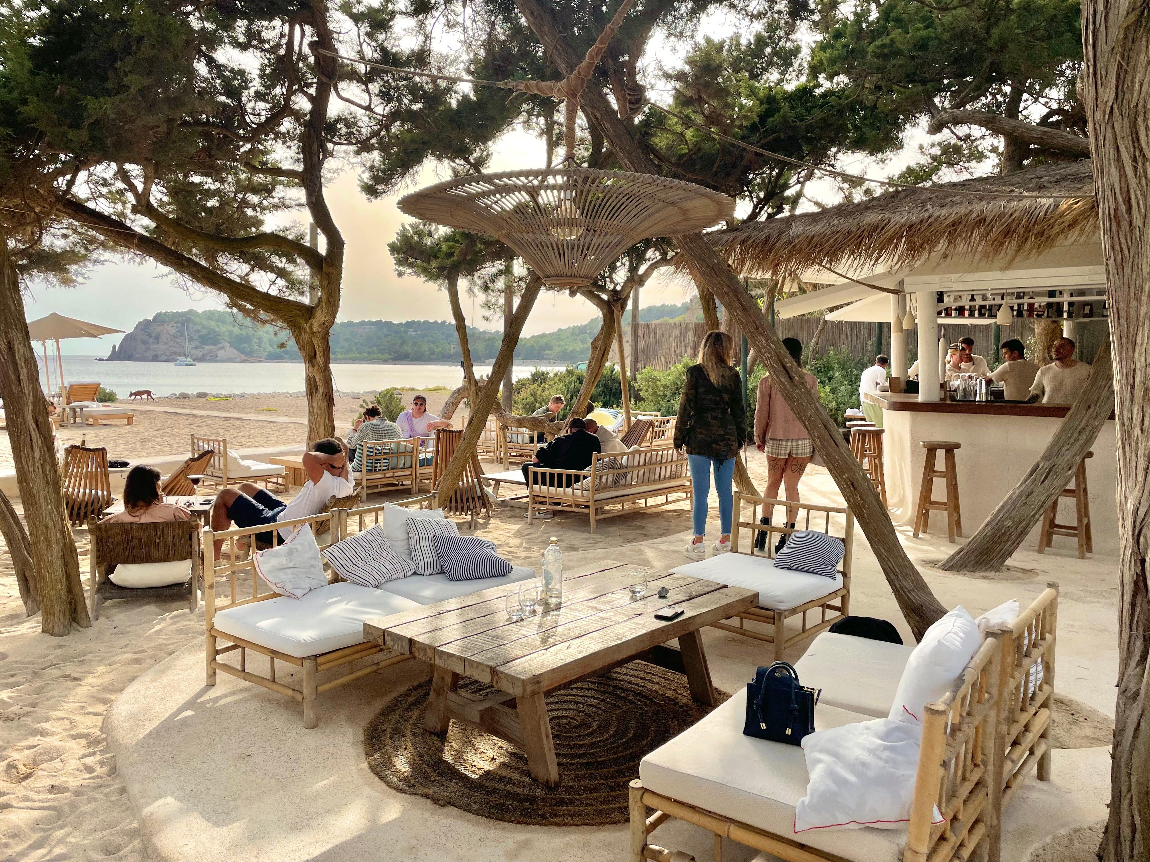 Het oog wil ook wat, vooral bij deze strandtent op Ibiza. Veel clubs werken met natuurlijke materialen, zoals hout en open ruimtes. Anderen kiezen voor strak wit en modern. Lounge-hoeken, bars en dansvloeren op het strand lopen vaak in elkaar over.